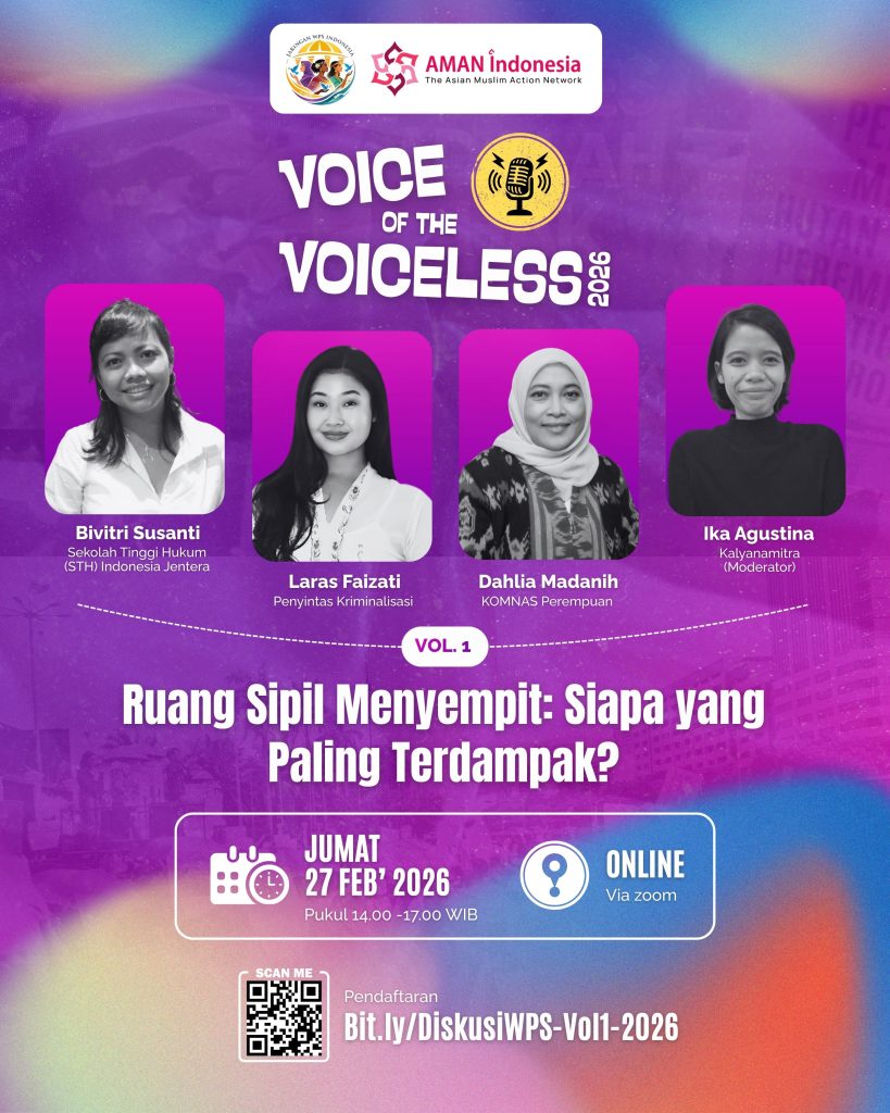 Jaringan WPS Indonesia bersama AMAN Indonesia akan menyelenggarakan Diskusi Serial WPS: Voice of the Voiceless 2026, Vol 1 “Ruang Sipil Menyempit: Siapa yang Paling Terdampak?” sebagai ruang berbagi pengalaman, refleksi bersama, dan penguatan kerja-kerja berjejaring antar organisasi masyarakat sipil, khususnya perempuan pembela HAM dan pegiat perdamaian.