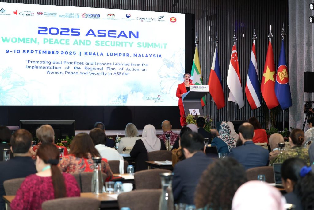 Her Excellency Ambra Dickie, Ambassador of Canada to ASEAN is delivering opening remarks at the 2025 ASEAN Women, Peace and Security Summit in Malaysia on 9 September 2025. Photo: UN Women
